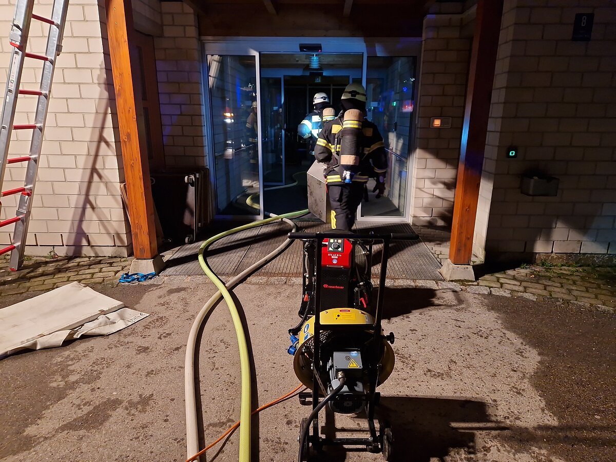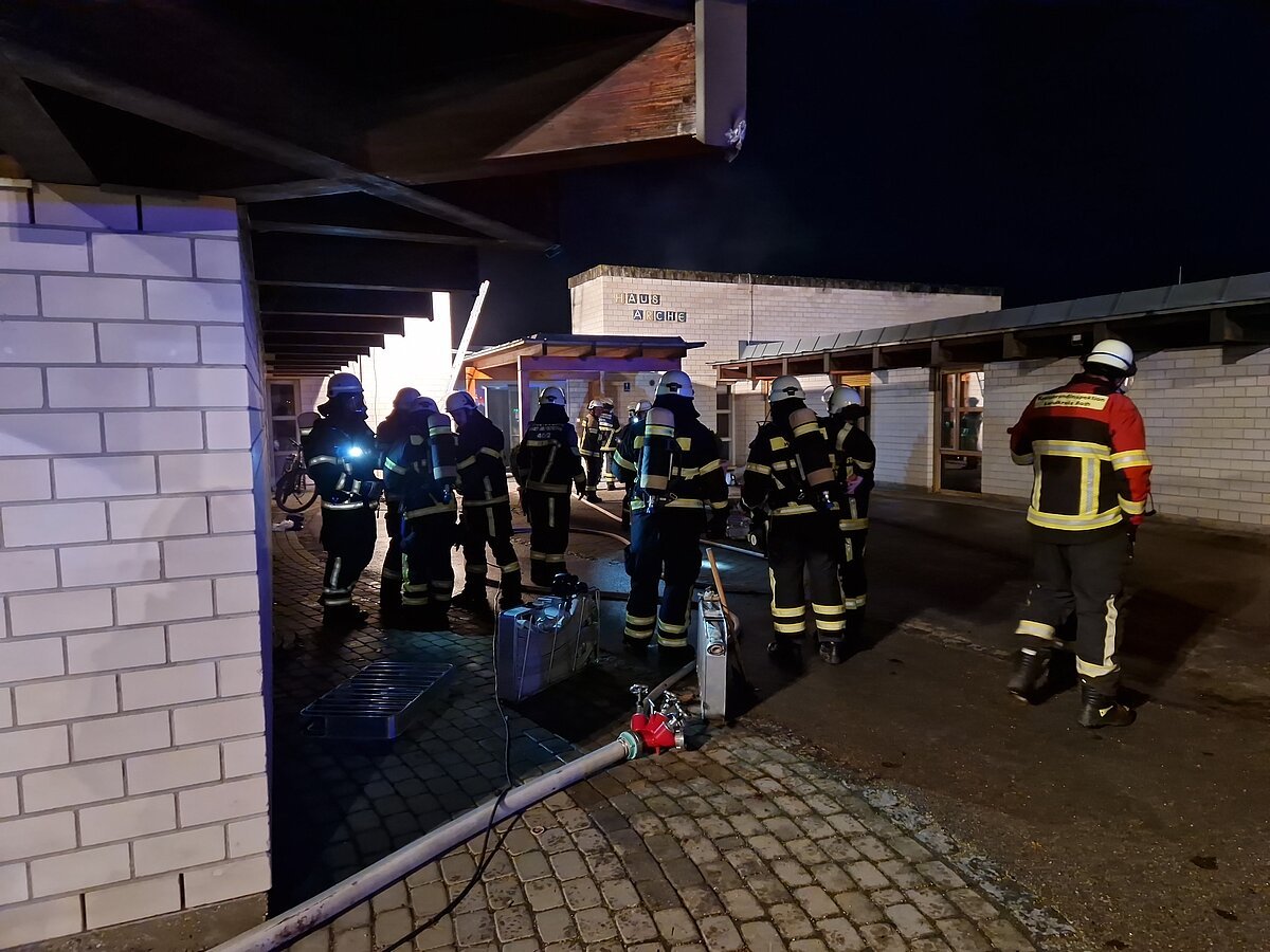 Ein Trupp unter Atemschutz begab sich zur Brandbekämpfung in das Gebäude. Beim Versuch den Strom abzuschalten stellte sich heraus, dass in der Putzkammer hinter der Umkleide der Brandherd lag. Dieser hatte sich über die Zwischendenke in die Umkleide ausgebreitet.