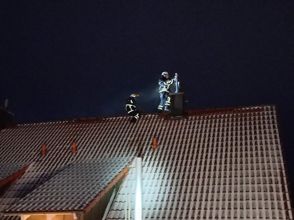 Wir fahren mit einem Löschfahrzeug an. Zusammen mit dem Bezirkskaminkehrer werden brennende Rußrückstände ausgekehrt und abgelöscht.