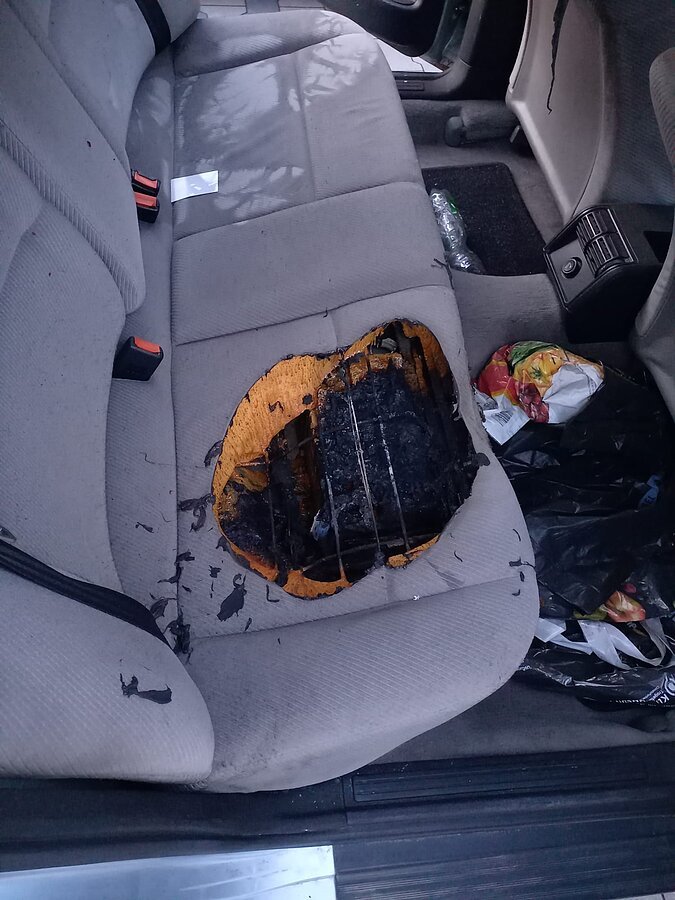 Bei Eintreffen wurde ein bereits erloschener Schwelbrand festgestellt. Die Fahrzeugbatterie unter der Rücksitzbank wurde durch Metall in der Polsterung kurzgeschlossen. Durch die Rauchentwicklung wurde das Fahrzeuginnere weitgehend zerstört.