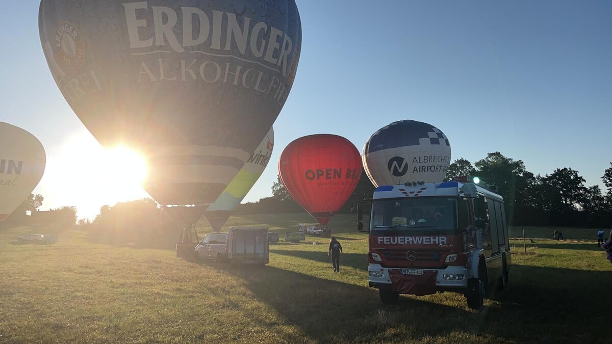 Für den Start der Heißluftballone am Schwimmstart des DATEV Challenge Triathlon wurde der Brandschutz mit einem Löschfahrzeug sichergestellt.