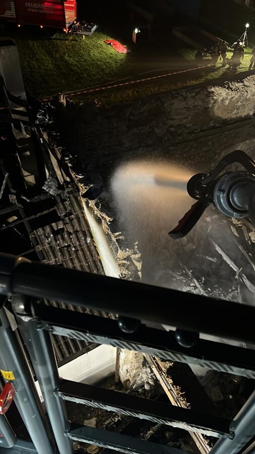 Da sich der Brand in der Zwischenzeit auf die Scheune ausgedehnt hatte begannen die ersten Einsatzkräfte mit einer Riegelstellung um die umliegenden Gebäude zu schützen.