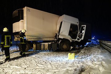 In der Nacht auf Sonntag wurde die Feuerwehr Hilpoltstein bereits zum zweiten Mal auf die A9 zu einem Einsatz alarmiert. Zwischen den Anschlussstellen Hilpoltstein und Greding kam ein LKW, beladen mit Blumen, bei schneeglatter Fahrbahn ins Rutschen und krachte in die Mittelschutzleitplanke. Der Lastwagen walzte etwa 50 Meter Leitplanke nieder, ehe sich das Führerhaus mit dem Auflieger verkeilte und der Sattelzug zum Stehen kam. Der Fahrer wurde bei dem Unfall leicht verletzt und kam mit dem Rettungsdienst in ein Krankenhaus. An der Einsatzstelle wurden ausgelaufene Betriebsstoffe abgebunden und die Verkehrsabsicherung übernommen.