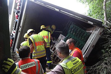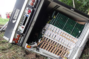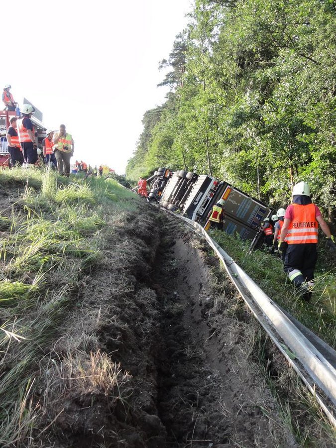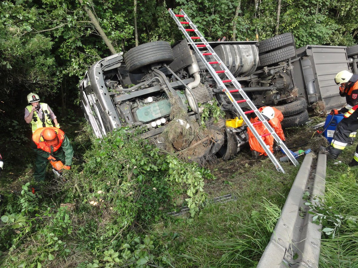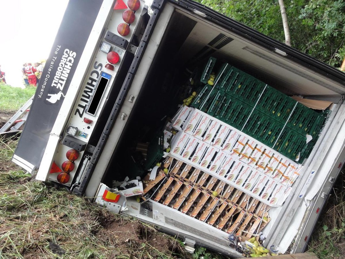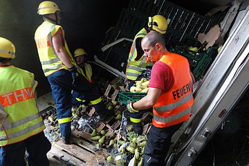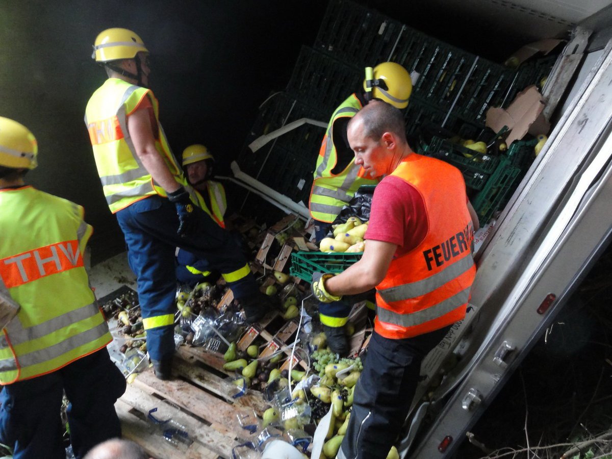Gemeldet wurde "auslaufender Kraftstoff aus einem LKW". Vor Ort wurde ein LKW vorgefunden, der von der Autobahn aufgrund eines Reifenplatzers abgekommen war und seitlich im Graben lag. Bei der Ladung handelte es sich um Obst und Gemüse.