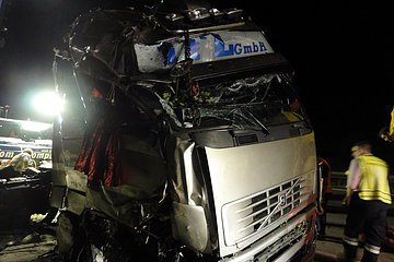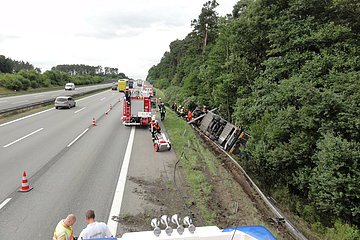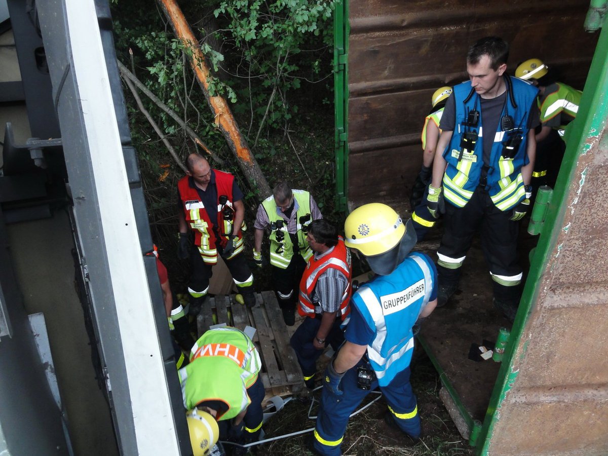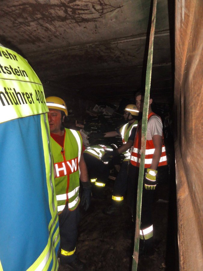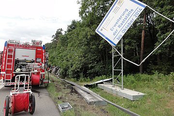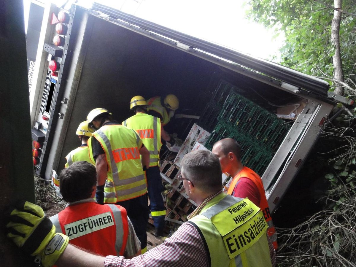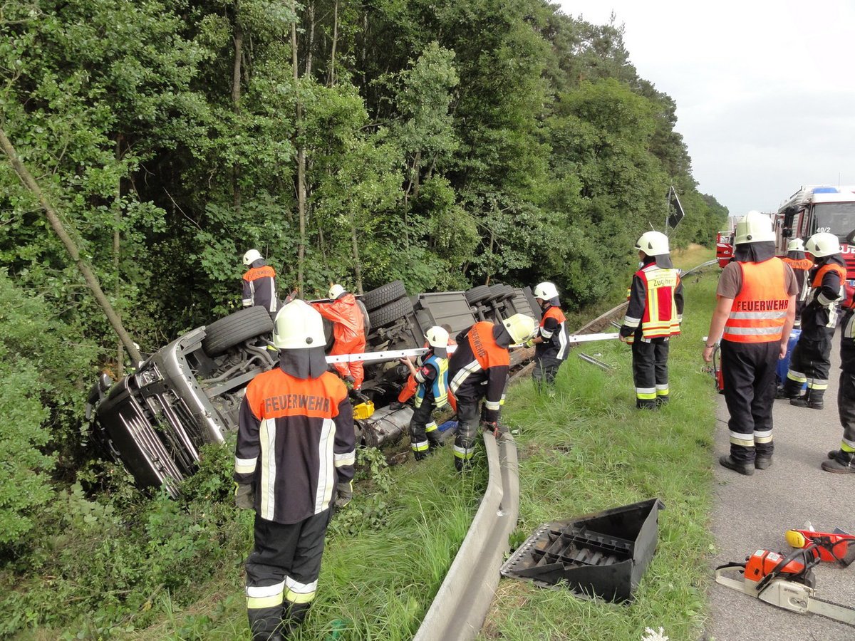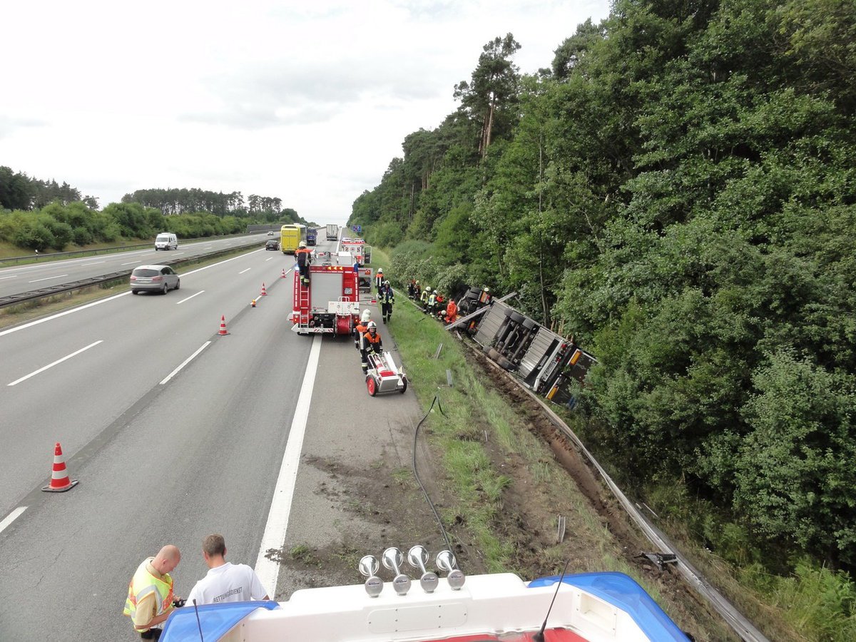 Gemeldet wurde "auslaufender Kraftstoff aus einem LKW". Vor Ort wurde ein LKW vorgefunden, der von der Autobahn aufgrund eines Reifenplatzers abgekommen war und seitlich im Graben lag. Bei der Ladung handelte es sich um Obst und Gemüse.