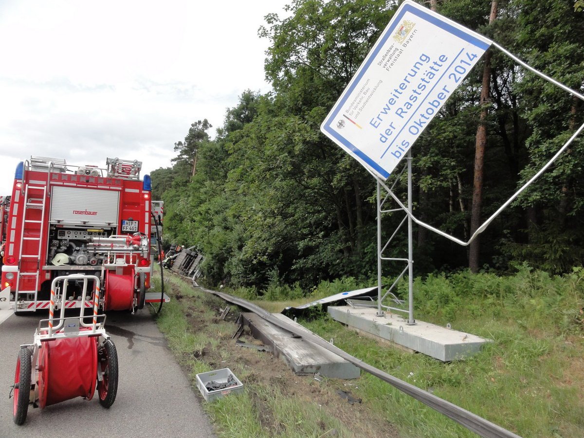 Heute Abend, gegen 17:00 Uhr, wurde die Feuerwehr Hilpoltstein zu einem LKW-Unfall auf die BAB 9 bei Kilometer 402, Fahrtrichtung Nürnberg alarmiert.