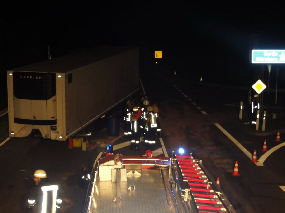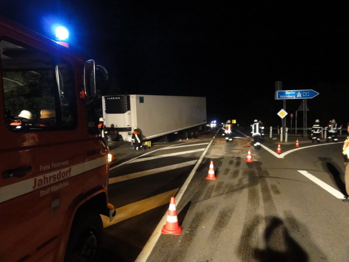 Aus bislang ungeklärter Ursache verlor ein LKW-Gespann seinen Sattelauflieger an der Autobahnbrücke Anschlussstelle Hilpoltstein und beschädigte seinen Treibstofftank. Auslaufender Kraftstoff musste durch die Feuerwehr gebunden und umgepumpt werden. Der Verkehr wurde bis zur Bergung des Sattelaufliegers an der Einsatzstelle vorbeigeleitet.