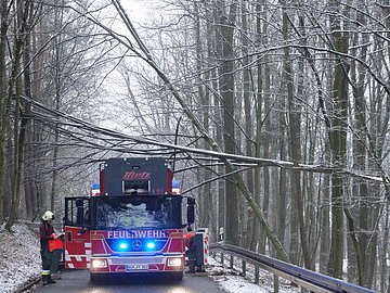 Auf der Ortsverbindungsstraße von Solar nach Eibach versperrten zwei abgebrochene Bäume die Straße. Die Bäume wurden mit der Drehleiter und der Motorsäge Stück für Stück zerkleinert und anschließend von der Fahrbahn beseitigt.