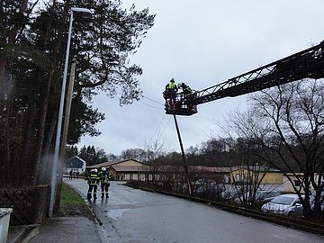 In der Industriestraße stürzte aufgrund von Sturmböen ein Baum über die Fahrbahn, riss dabei eine Telefonleitung ab und beschädigte zwei Telefonmasten. Der Baum wurde mittels Kettensäge beseitigt und die Telefonleitung sowie die beiden Masten entfernt.