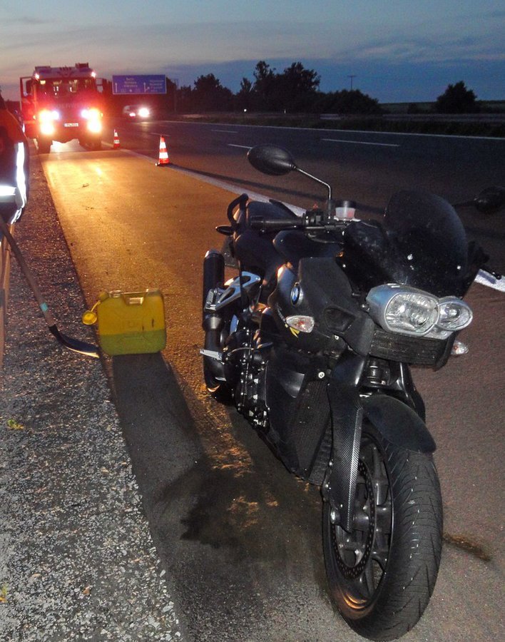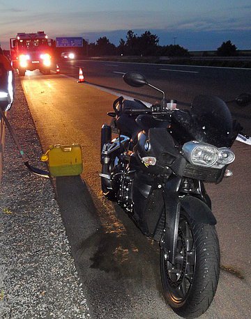 Während der Einsatzfahrt zum PKW-Brand wurde das Hilfeleistungslöschfahrzeug zu einem gemeldeten Motorradbrand auf die BAB 9 Fahrtrichtung München gerufen. An der Einsatzstelle stellte sich heraus, dass es sich um einen Motorplatzer handelte. Das auslaufende Öl wurde mittels Ölbindemittel gebunden. Weiterhin wurde die Verkehrsabsicherung übernommen.