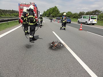 Während den Vorbereitungen zum Tag der offenen Tür alarmierte die ILS Mittelfranken Süd die Feurwehr Hilpoltstein zu einem Brand auf die A9. Zwischen den Anschlussstellen Hilpoltstein und Allersberg brannte auf der linken Fahrspur ein verlorener Tankrucksack. Mit dem Schnellangriffsschlauch war der Brand schnell gelöscht.