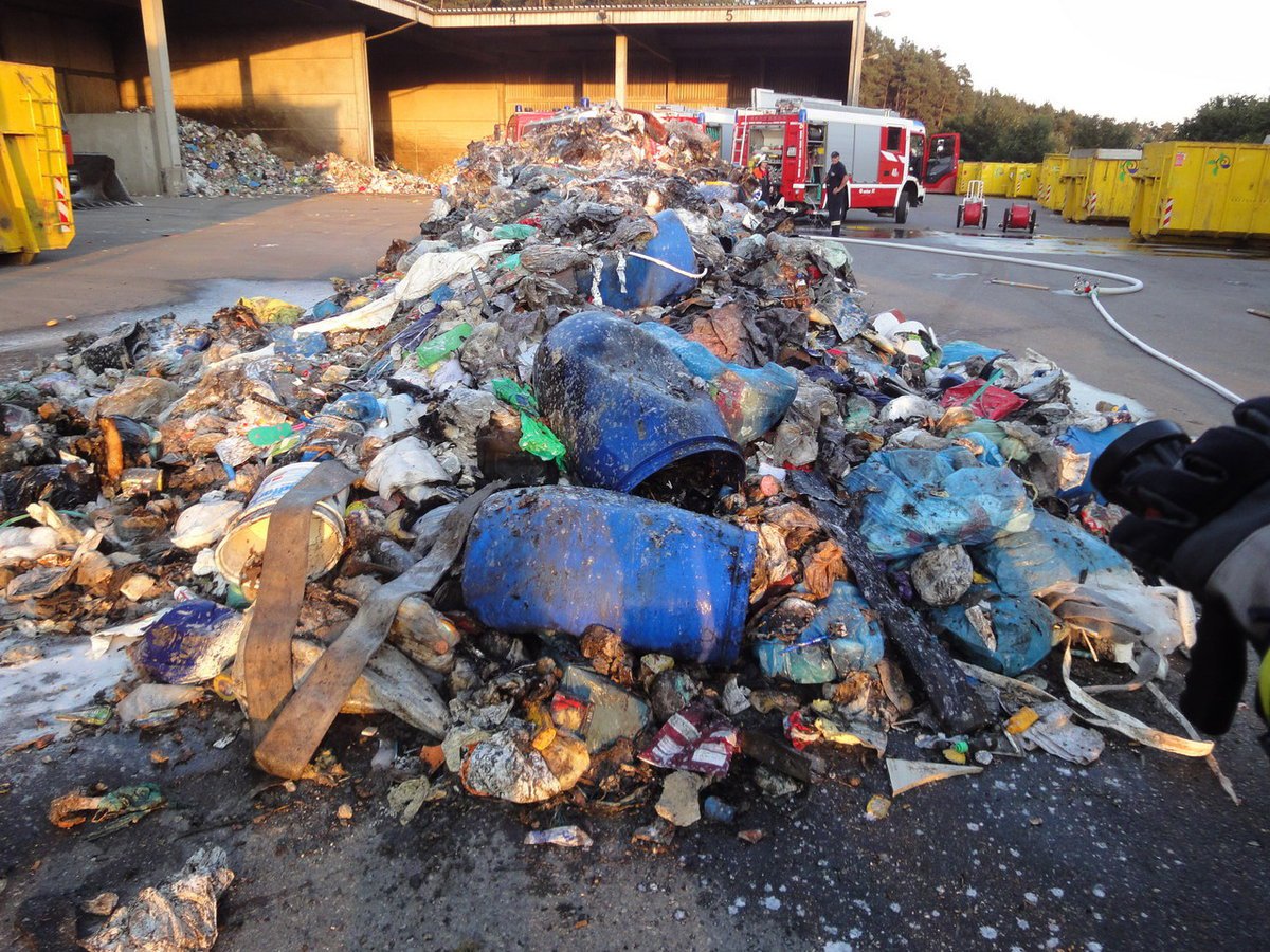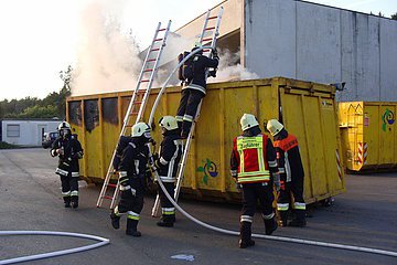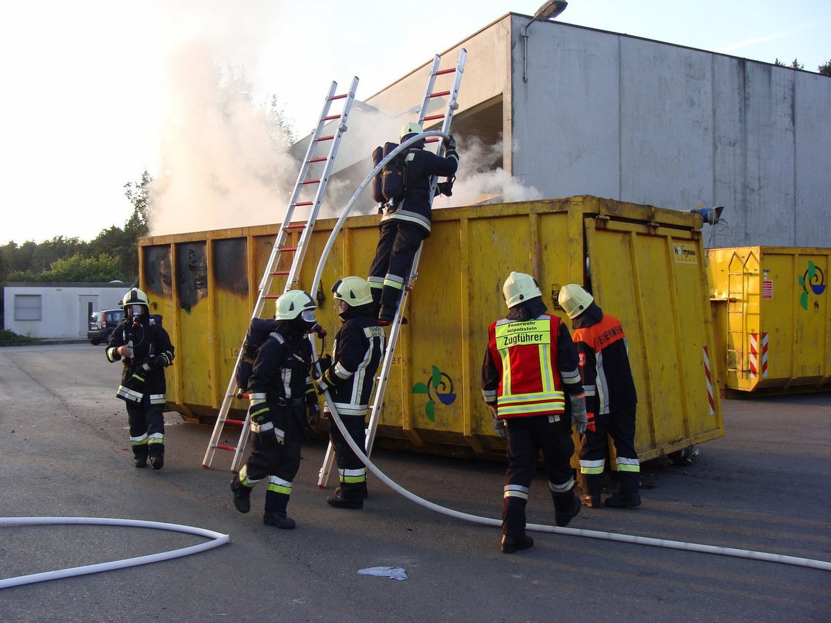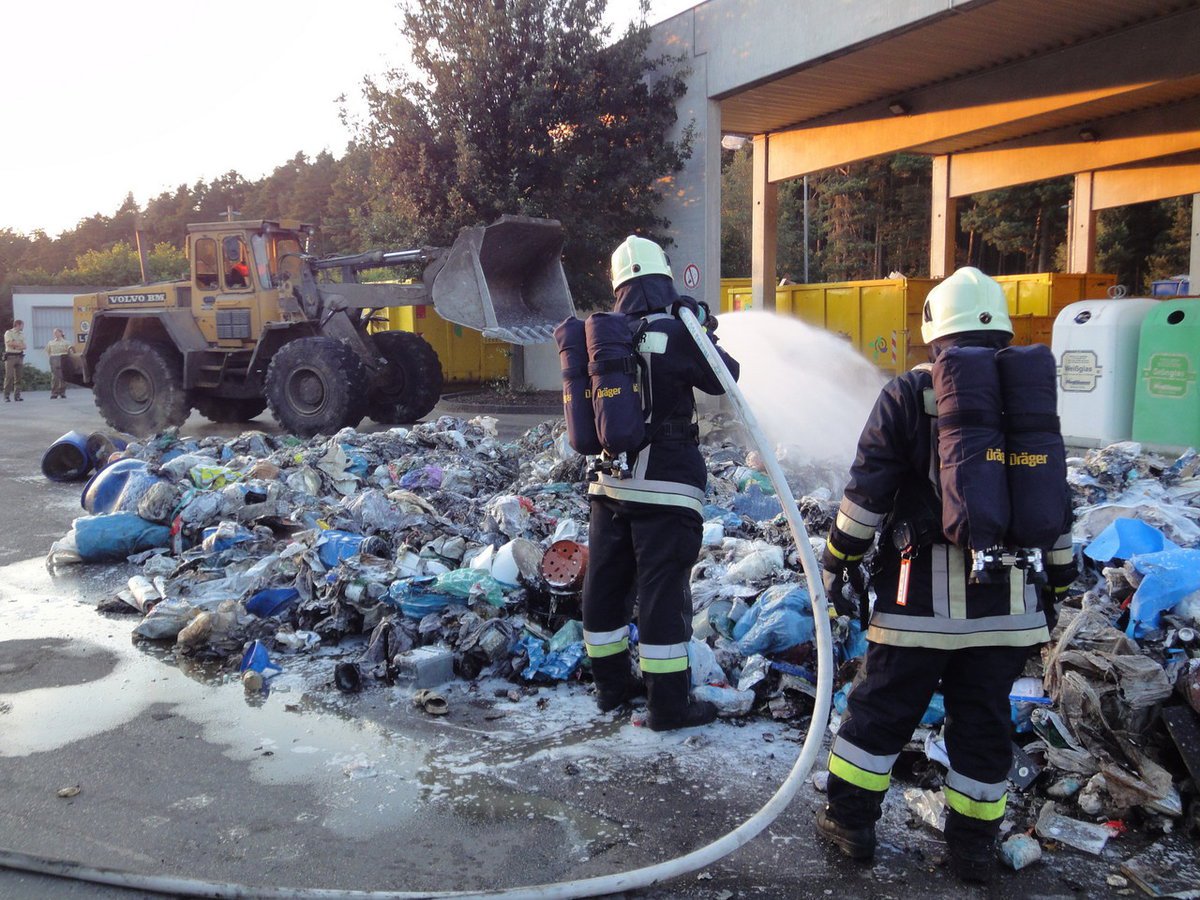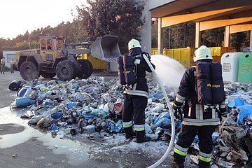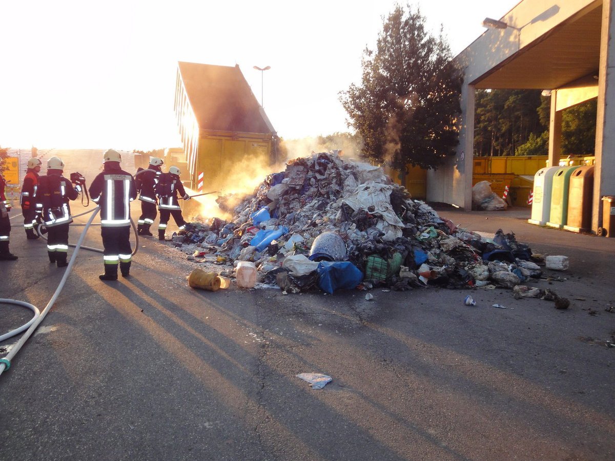 Auf der Wertstoffsortieranlage in Pyras brannte ein Container mit Kunststoffabfällen. Nach dem Auskippen des Abfalles wurde dieser mit einem Radlader verteilt und anschließend abgelöscht.