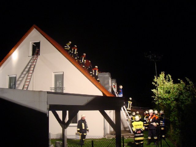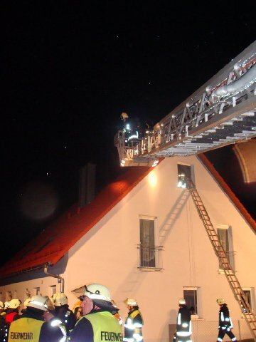 Heute Nacht rückte die Feuerwehr Hilpoltstein zur Unterstützung mit der Drehleiter und der Wärmebildkamera nach Allersberg aus. Dort geriet vermutlich durch einen Blitzschlag der Dachstuhl eines Doppelhauses in Brand. Die Feuerwehren aus Allersberg, Hilpoltstein, Göggelsbuch und Altenfelden konnten den Brand unter Kontrolle bringen.