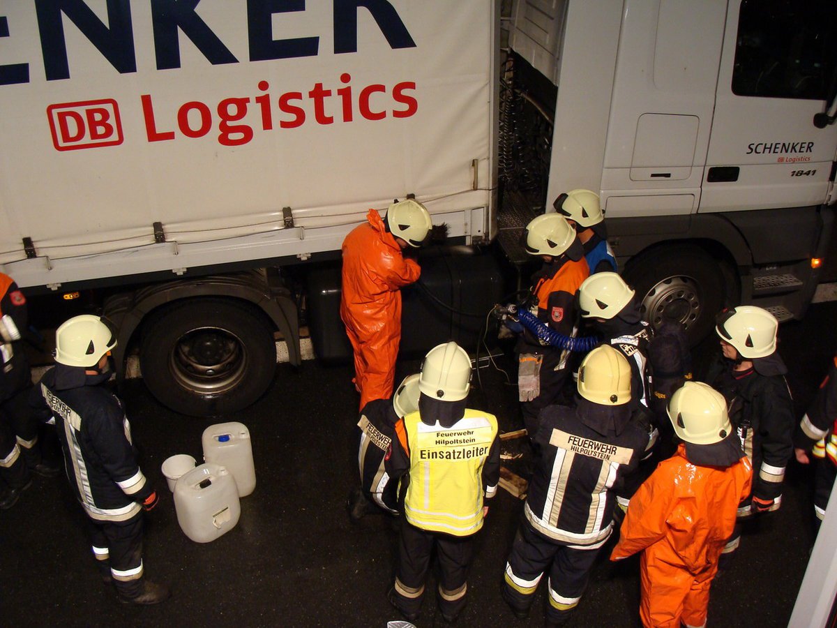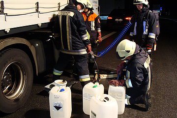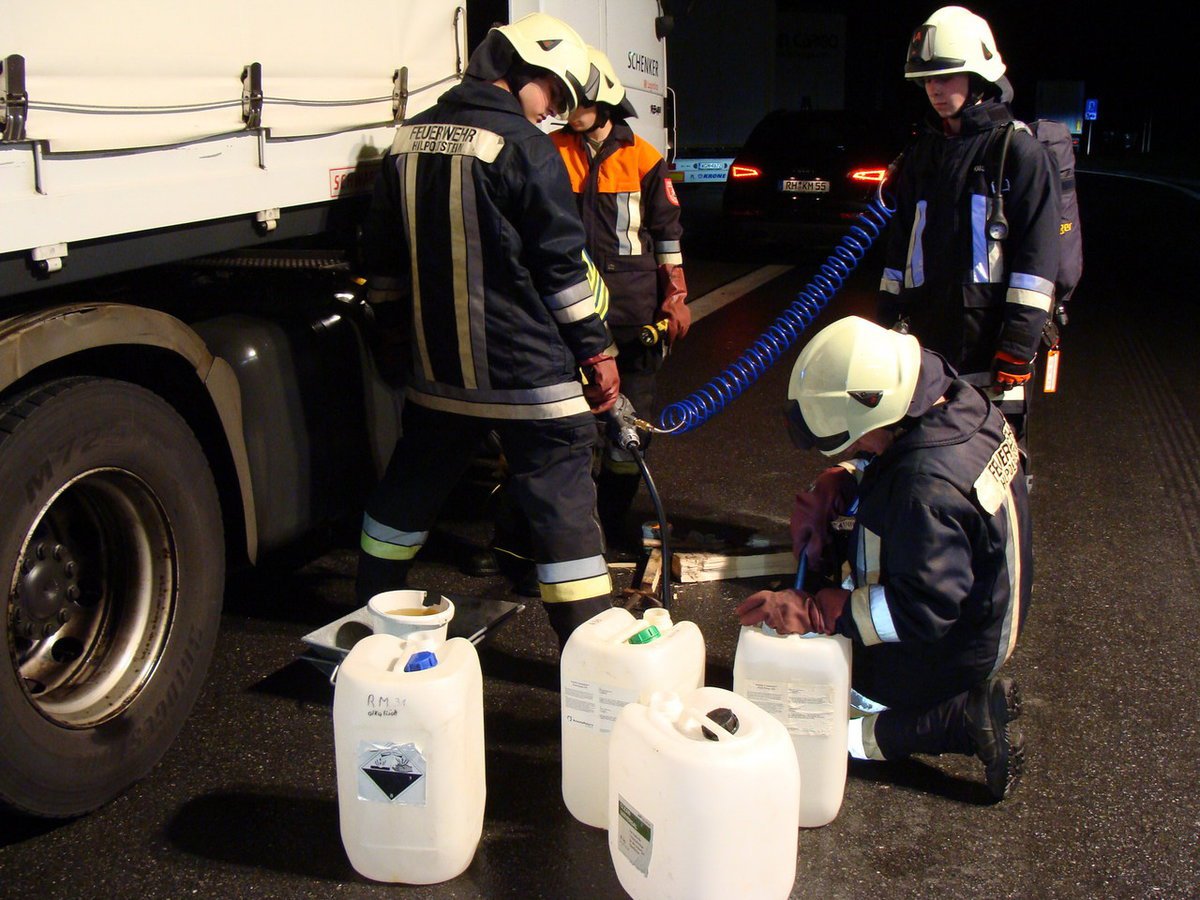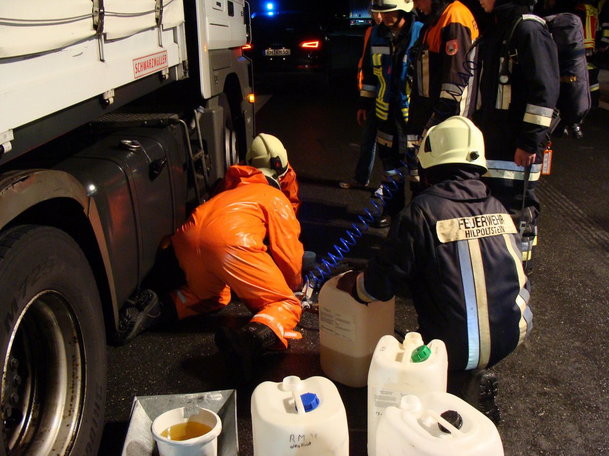 Aufgrund eines Unfalles auf der A9 in Richtung Nürnberg wurden Gegenstände auf die Gegenfahrbahn geschleudert. Ein LKW-Fahrer erkannte dies zu spät, wodurch sein Dieseltank beschädigt wurde. Der LKW kam im Parkplatz Offenbau zum Stehen. Mit Wannen wurde der auslaufende Kraftstoff aufgefangen und der restliche Tankinhalt umgepumpt. Die verursachte Dieselspur auf der Autobahn in Richtung München wurde von der Feuerwehr Allersberg übernommen.