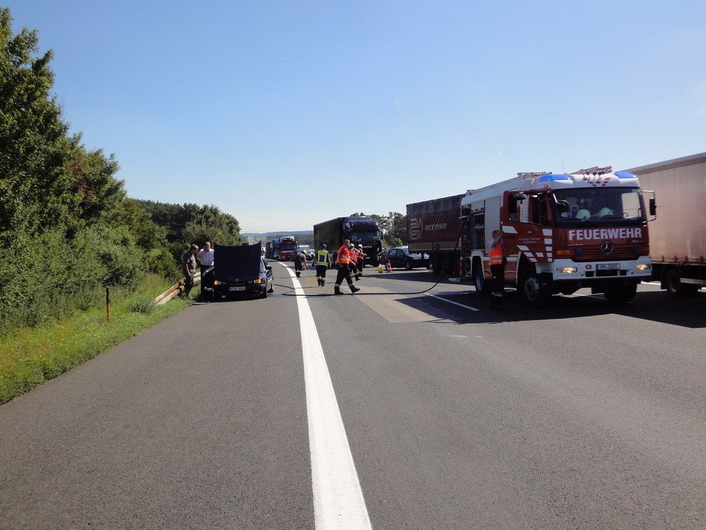 Auf der Anfahrt zu dem vorherigen Einsatz, wurde im Stau ein rauchender PKW festgestellt. Es stellte sich heraus, dass ein Kühlerschlauch geplatzt war. Das ausgetretene Kühlwasser, welches sich über zwei Fahrspuren verteilt hatte, wurde mit Bindemittel abgebunden.