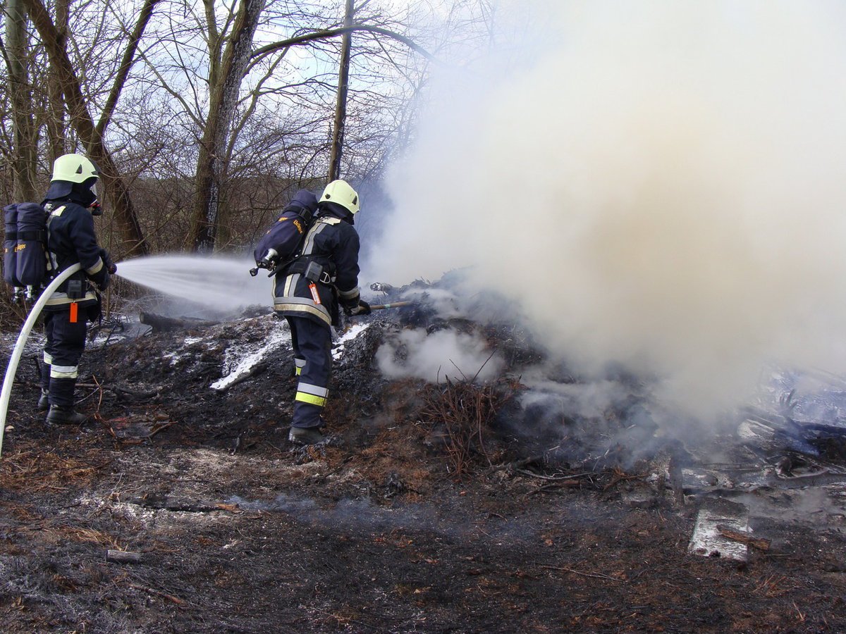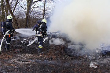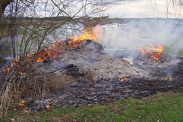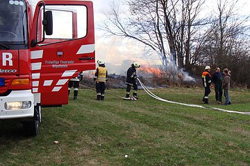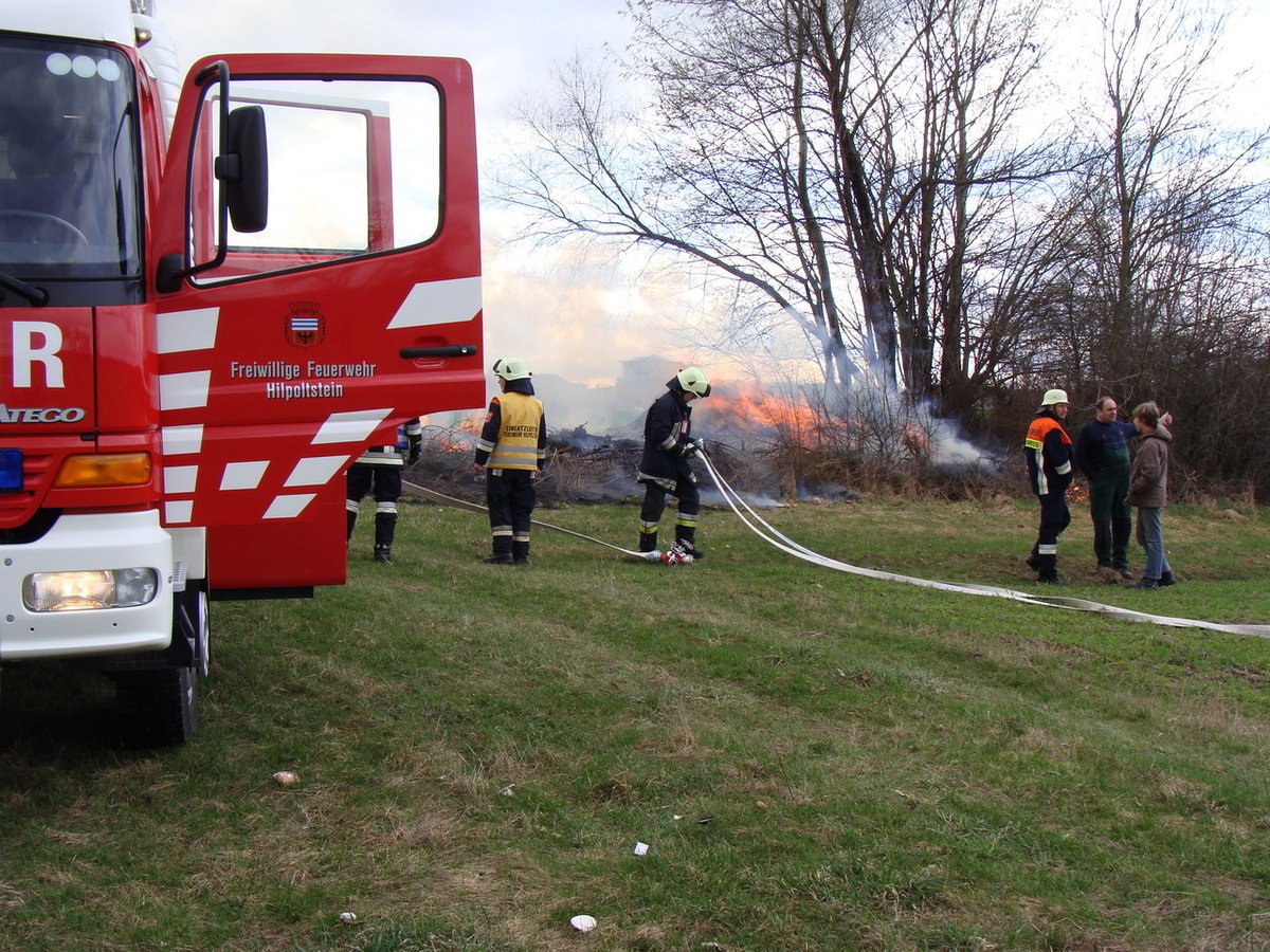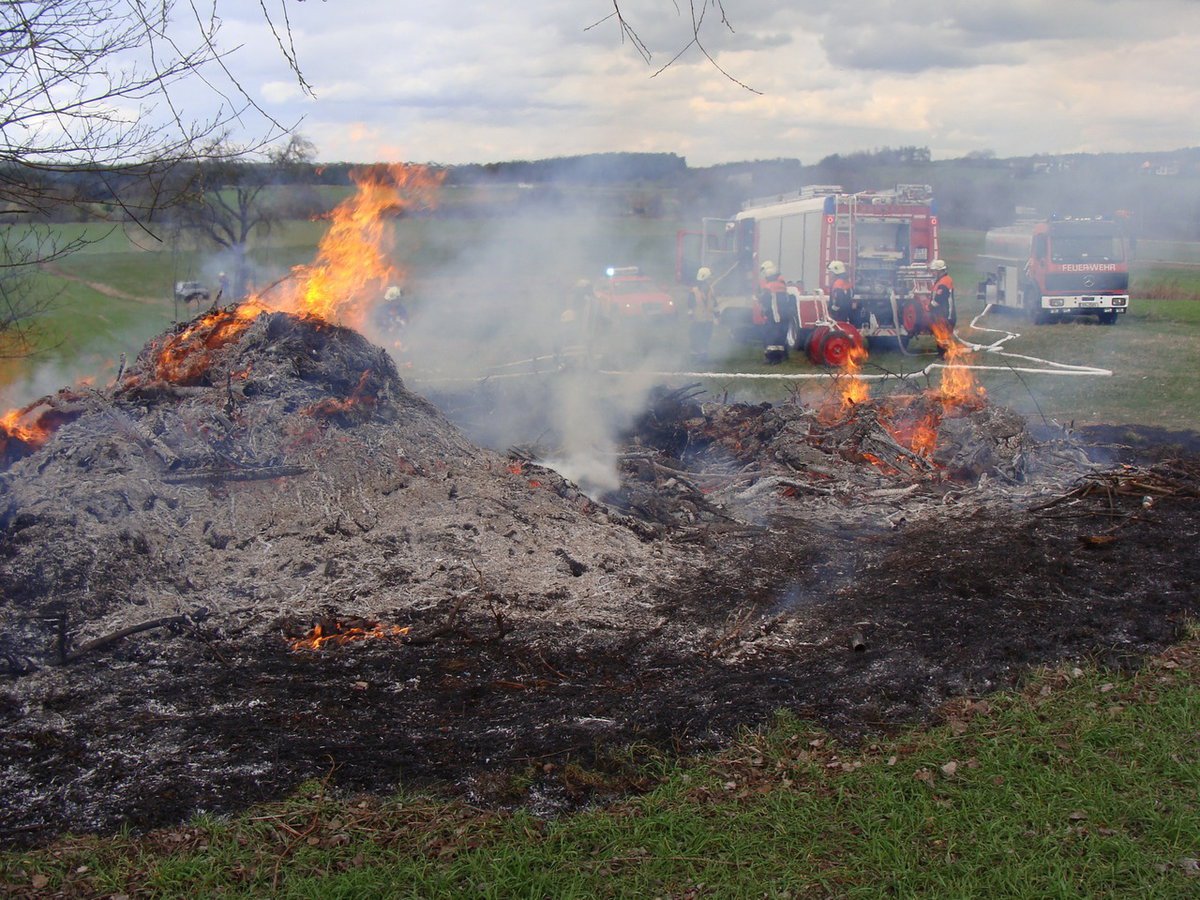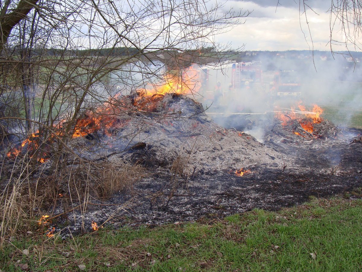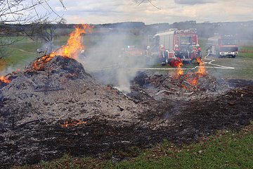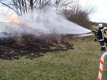 Am heutigen Mittwoch brannte aus noch ungeklärter Ursache unterhalb des Neubaugebietes eine Hecke. Durch den Einsatz von drei C-Rohren und einem Trupp unter schwerem Atemschutz war der Brand schnell unter Kontrolle. Mit einem kleinen Radlader wurde der Gestrüpphaufen auseinandergezogen, um so an die Glutnester zu gelangen.