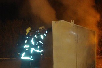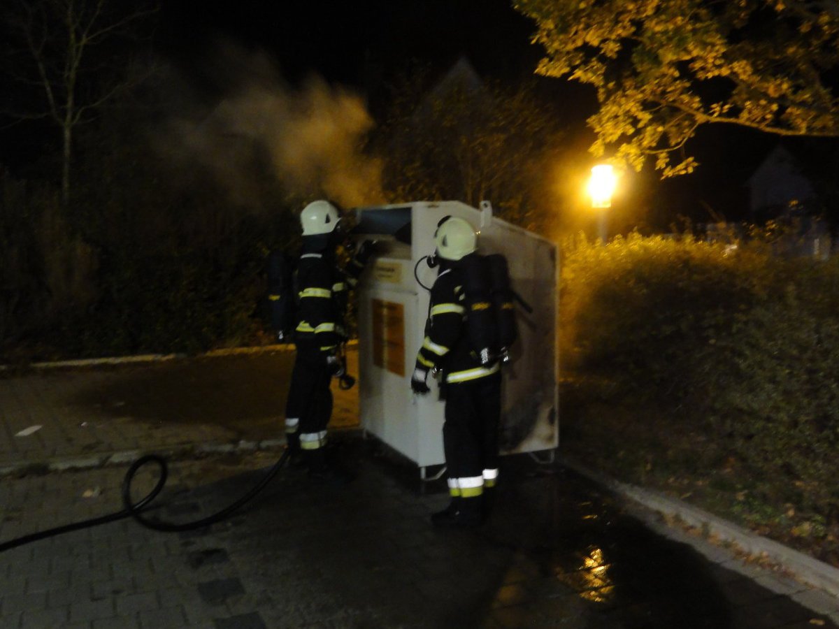 Über die Feuerwehr Hofstetten wurde ein brennender Kleidercontainer am Kindergarten Hofstetten mitgeteilt. Der Container wurde geöffnet und der Brand gelöscht. Als Grund stellten sich Kinder heraus, die ein Halloweenfeuerwerk in den Container warfen.