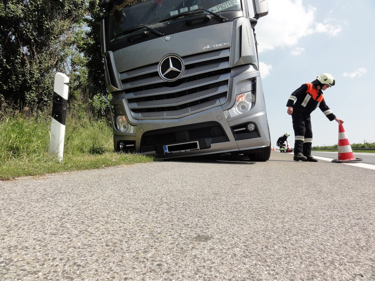 Die Feuerwehr Hilpoltstein wurde am frühen Nachmittag auf die A9, Fahrtrichtung Nürnberg, zu einem LKW-Brand alarmiert. Beim Eintreffen der Feuerwehr stand ein LKW neben der Fahrbahn auf dem Grünstreifen. Durch das Einsinken der Räder lag der heiße Auspuff auf dem trockenen Graß auf und entzündete dieses. Der Brand, welcher bereits mit einem Feuerlöscher abgelöscht war, wurde durch die Feuerwehr kontrolliert, anschließend rückten die Kräfte wieder ein.