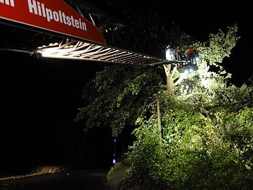 In der Nacht auf Mittwoch zog ein Unwetter nicht spurlos über den Ortsteil Eibach. Auf der Ortsverbindungsstraße Patersholz - Eibach mussten abgebrochene Äste von einem Baum mit Hilfe der Drehleiter und Motorsäge entfernt werden. In Eibach vielen mehrere größere Äste auf ein Carport und beschädigten dieses. Mit dem Einsatz der Motorsäge und der DLK wurde auch diese Einsatzstelle abgearbeitet.