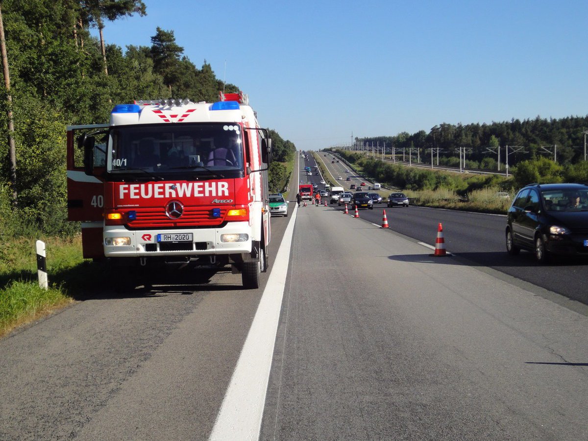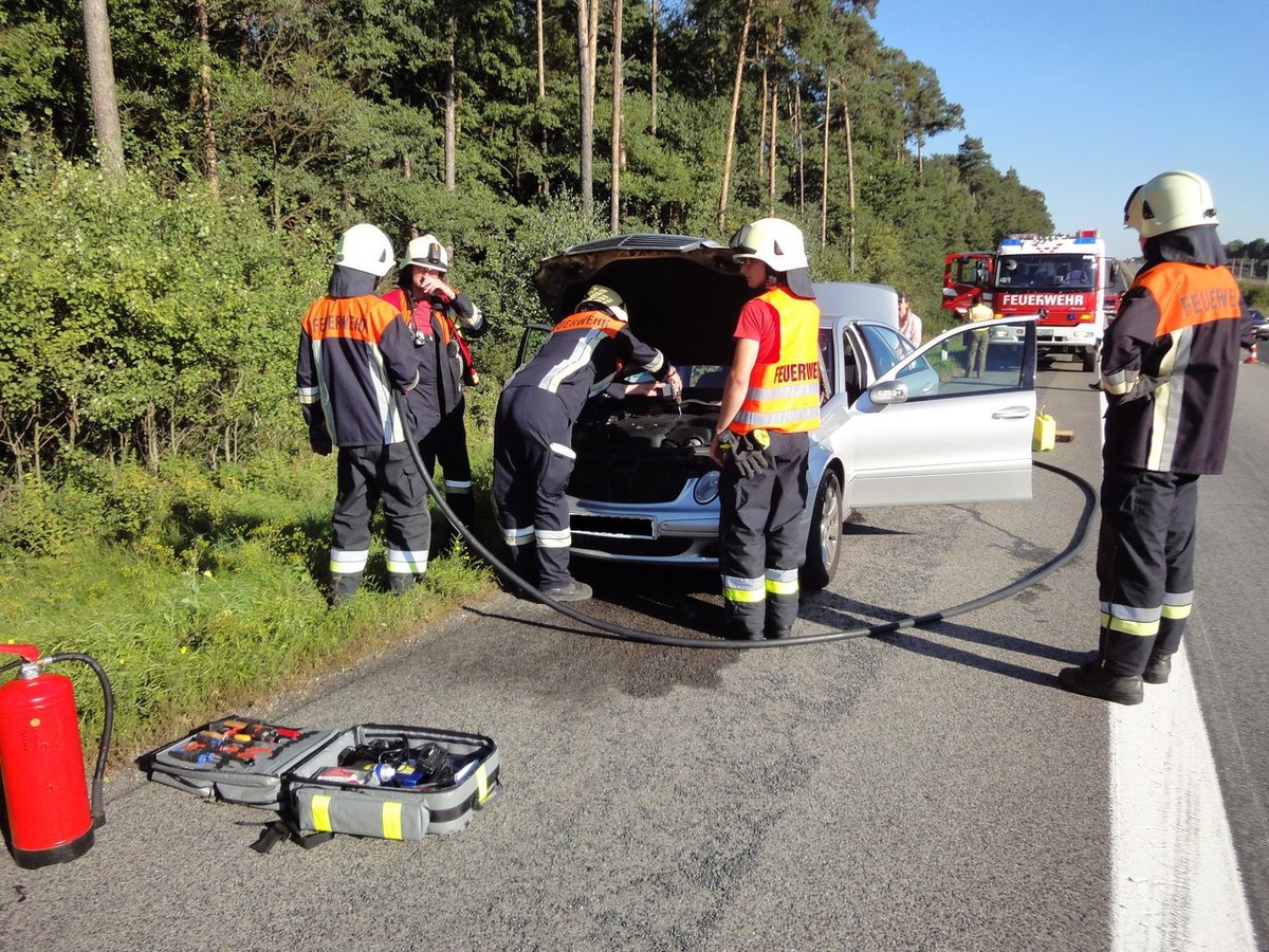 Ein PKW blieb aufgrund eines Motorplatzers auf der A9 zwischen den Anschlussstellen Hilpoltstein und Allersberg liegen und verursachte eine Ölspur. Beim Eintreffen der alarmierten Feuerwehr Hilpoltstein befand sich weiterhin Rauch im Innenraum des PKW´s. Der Brandschutz wurde sichergestellt sowie das Auto vorsichtig geöffnet. Desweiteren übernahm die Feuerwehr die Verkehrsabsicherung und band das ausgelaufene Öl. Nach dem Abschleppen des PKW´s konnte der Einsatz beendet werden.
