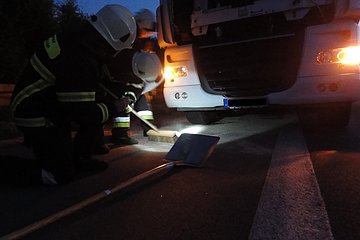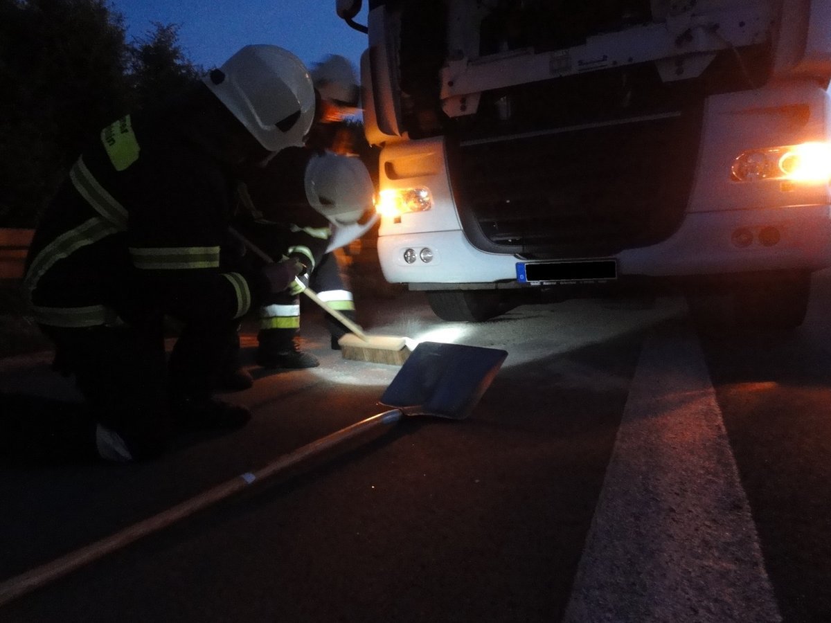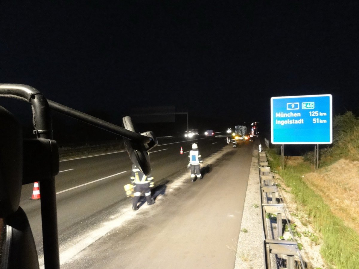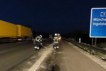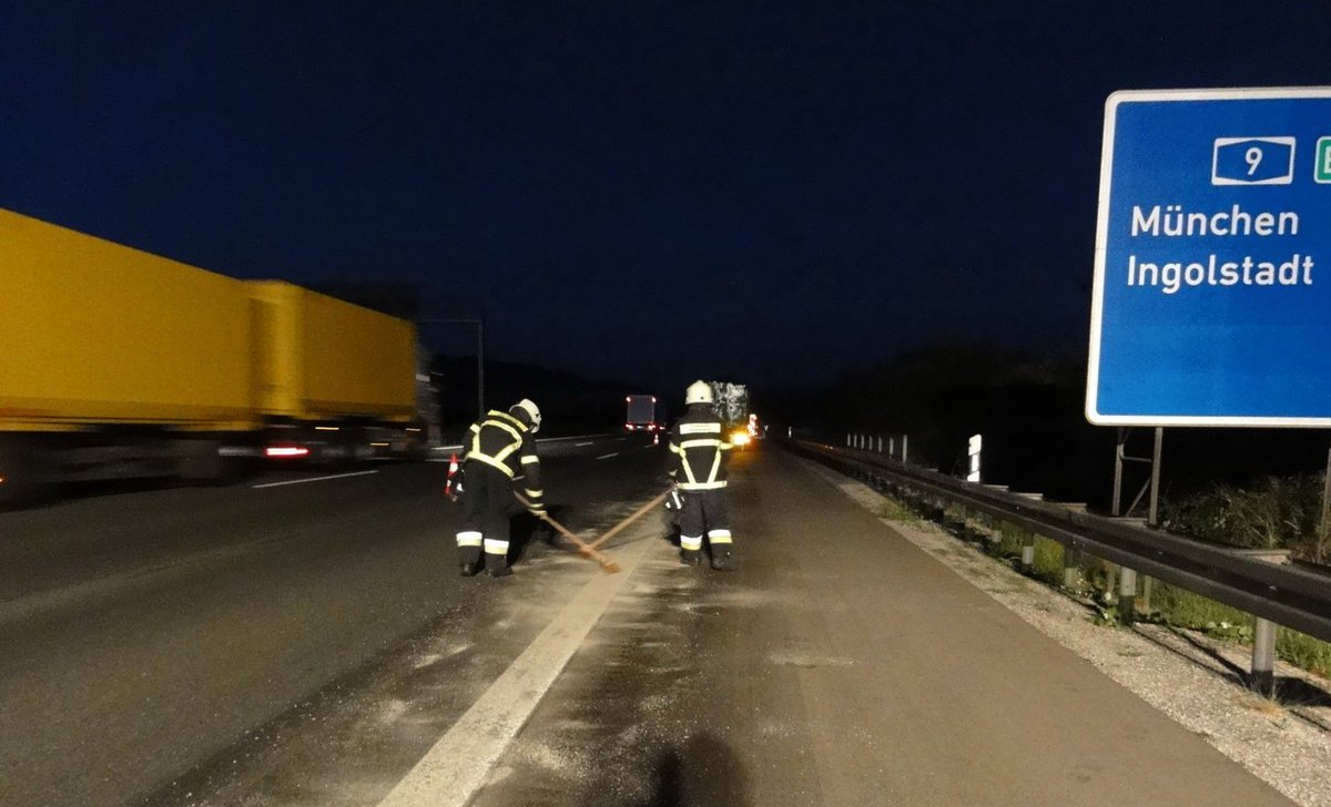 Am frühen Donnerstagmorgen wurde die Feuerwehr Hilpoltstein von der Leitstelle Schwabach auf die A9 zwischen Hilpoltstein und Greding alarmiert. Kurz nach der Anschlussstelle Hilpoltstein verursachte ein LKW aufgrund eines Schadens am Turbolader eine circa 300 Meter lange Ölspur, die gebunden werden musste.