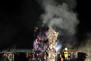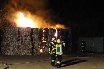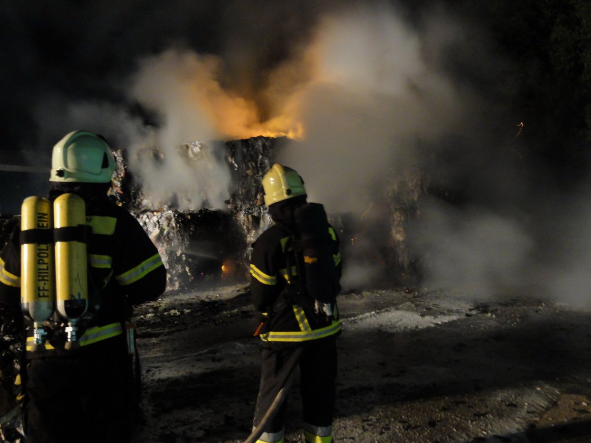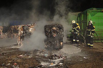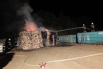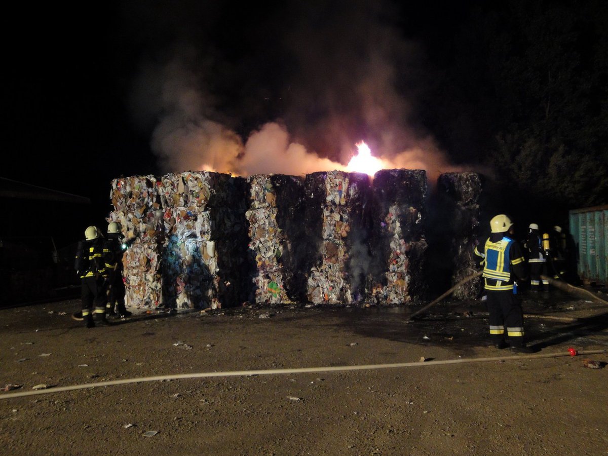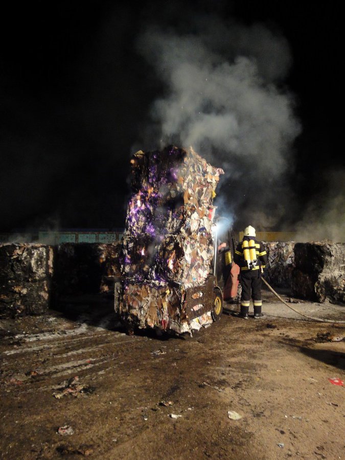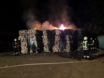 Heute Morgen kam es zu einem Brand von ca. 80 gepressten Papierballen in einer Papiersortieranlage bei Pyras. Gegen 00:30 Uhr wurden die Feuerwehren aus Patersholz, Jahrsdorf und Hilpoltstein mit der Einsatzmeldung "Containerbrand" alarmiert. Mit mehreren Trupps unter Atemschutz konnte eine Ausbreitung auf weitere Papierballen verhindert werden, das Löschwasser wurde im Pendelverkehr mit den Tanklöschfahrzeugen unserer Wehr sichergestellt. Zum endgültigen Ablöschen der Glutnester mussten die Papierballen mit zwei Ladern auf dem Firmengelände verteilt werden. Der große Bedarf an Atemschutzgeräten wurde von der nachalarmierten Unterstützungsgruppe Atemschutz vom Landkreis Roth abgedeckt.