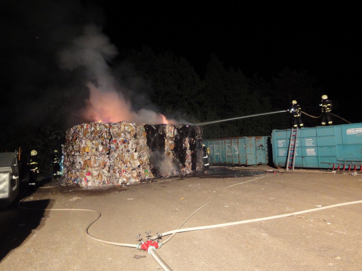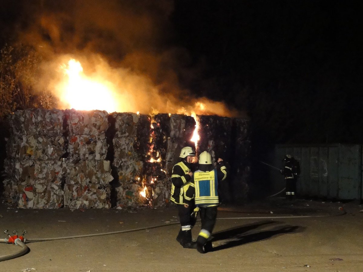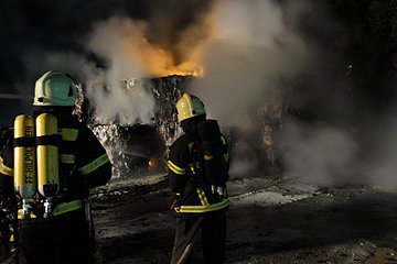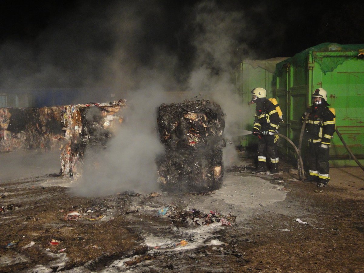 Heute Morgen kam es zu einem Brand von ca. 80 gepressten Papierballen in einer Papiersortieranlage bei Pyras. Gegen 00:30 Uhr wurden die Feuerwehren aus Patersholz, Jahrsdorf und Hilpoltstein mit der Einsatzmeldung "Containerbrand" alarmiert. Mit mehreren Trupps unter Atemschutz konnte eine Ausbreitung auf weitere Papierballen verhindert werden, das Löschwasser wurde im Pendelverkehr mit den Tanklöschfahrzeugen unserer Wehr sichergestellt. Zum endgültigen Ablöschen der Glutnester mussten die Papierballen mit zwei Ladern auf dem Firmengelände verteilt werden. Der große Bedarf an Atemschutzgeräten wurde von der nachalarmierten Unterstützungsgruppe Atemschutz vom Landkreis Roth abgedeckt.