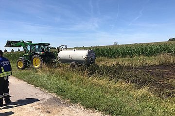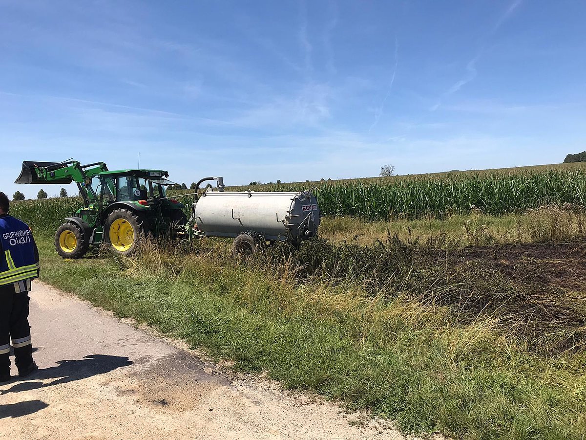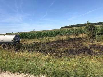 Ein Gebüsch zwischen Weinsfeld und Offenbau war in Brand geraten. Ein ortsansässiger Landwirt konnte das Feuer mit seinem Jauchefass ablöschen.