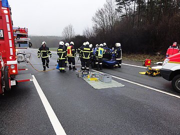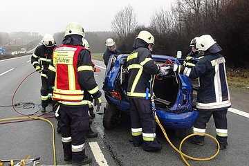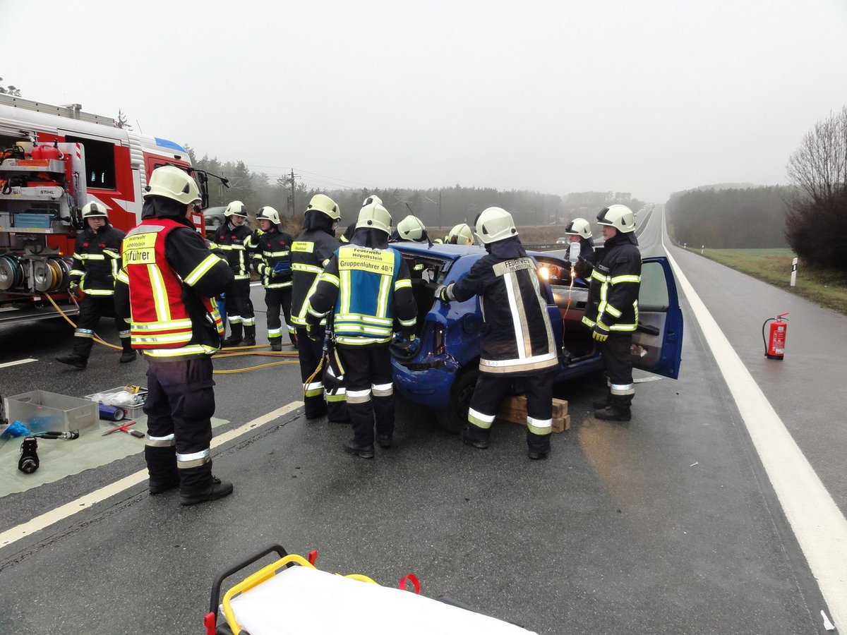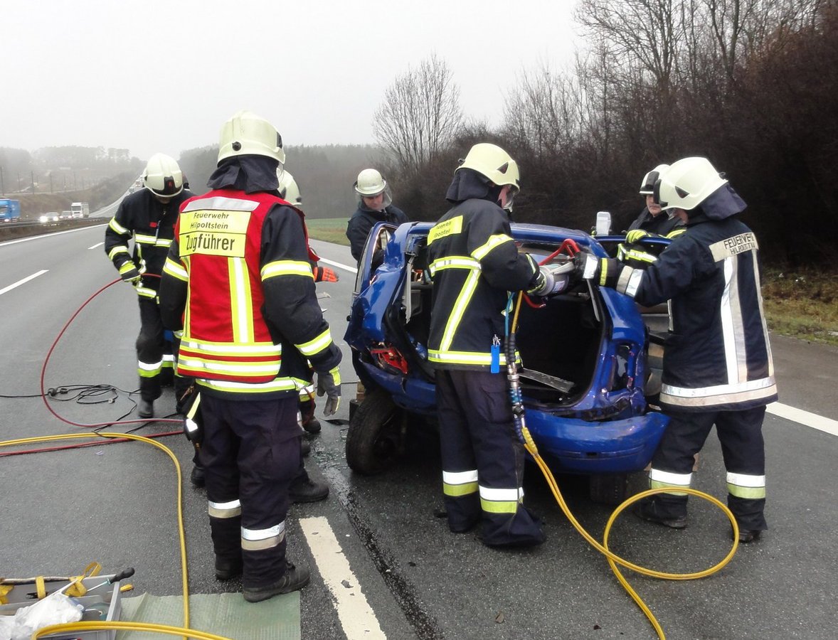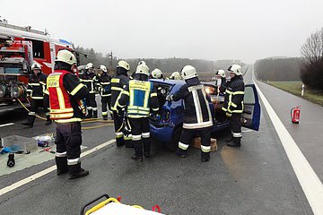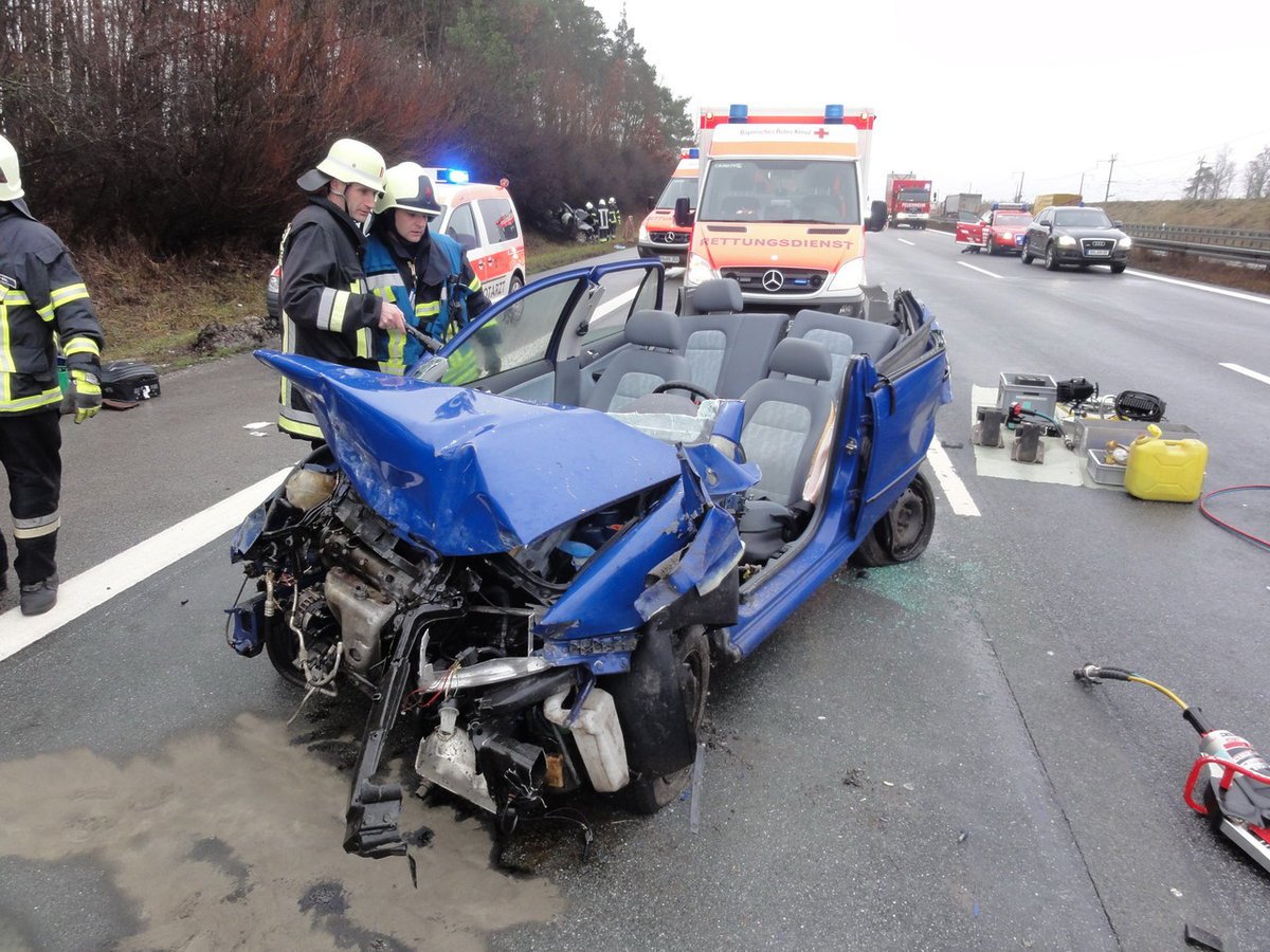 Auf der A9 zwischen den Anschlussstellen Hilpoltstein und Allersberg ereignete sich am Mittwochvormittag ein schwerer Verkehrsunfall. Beteiligt waren mehrere PKW, sowie ein LKW. Bei einer PKW-Fahrerin, die sich bei Eintreffen der Rettungskräfte noch im Fahrzeug befand, konnten Verletzungen der Wirbelsäule nicht ausgeschlossen werden. Deshalb wurde durch Anweisung des Notarztes eine patientenschonende Rettung vorbereitet. Mit Hilfe von schwerem Rettungsgerät wurde das Dach des PKW entfernt und die Person achsengerecht aus dem PKW gehoben. Weitere am Unfall beteiligte Personen erlitten leichtere Verletzungen und wurden vom Rettungsdienst versorgt. Desweiteren mussten Betriebsstoffe von der Feuerwehr Hilpoltstein gebunden und der Brandschutz sichergestellt werden. Die Autobahn blieb während des Einsatzes in Richtung Nürnberg komplett gesperrt.