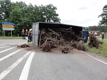 Ein LKW war beim Abbiegen von der Staatstraße 2225 Hilpoltstein - Unterrödel an der Pyraser Kreuzung umgefallen und blieb seitlich auf der RH24, Richtung Pyras liegen. Der Fahrer konnte sich bereits aus seinem Führerhaus leicht verletzt retten und wurde vom BRK versorgt.