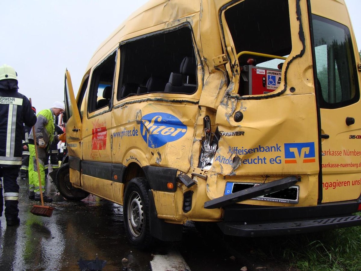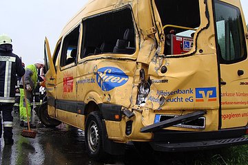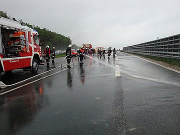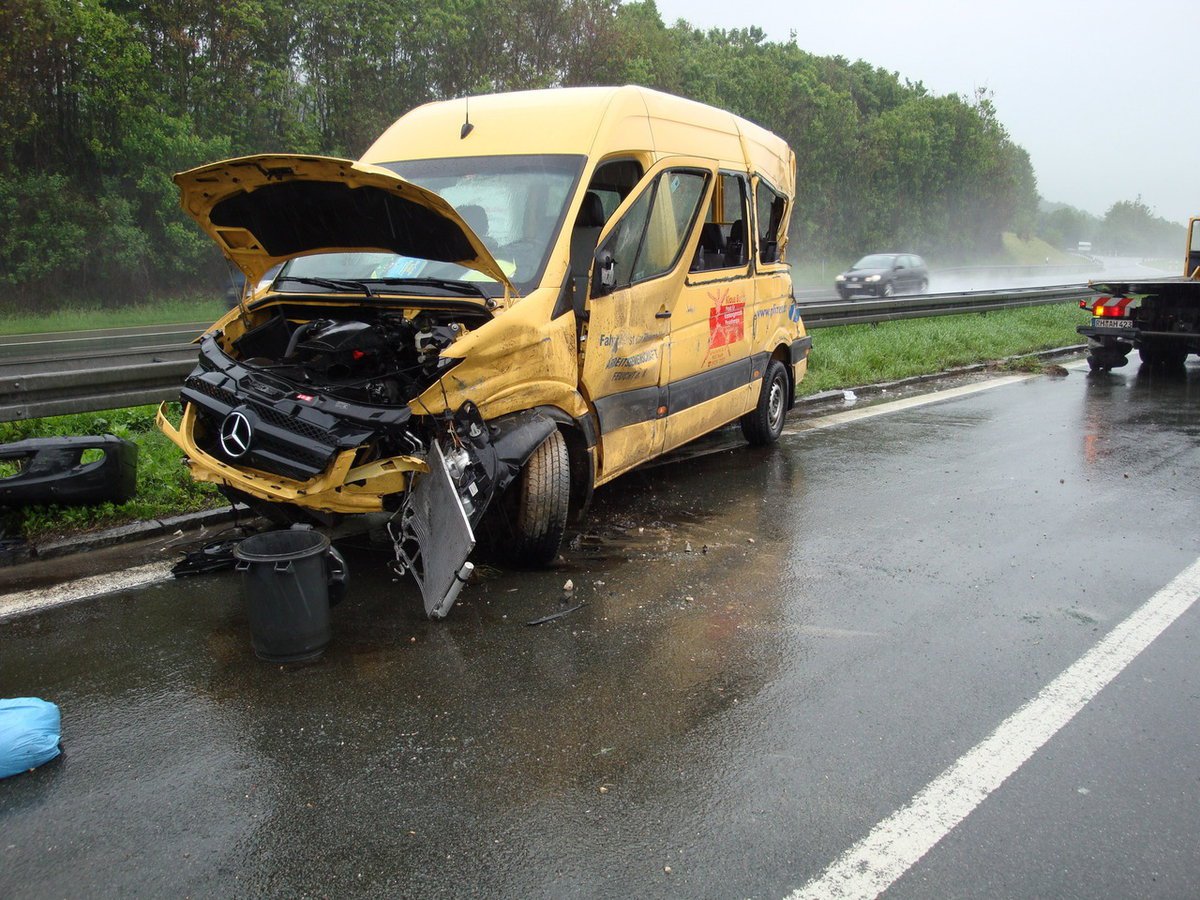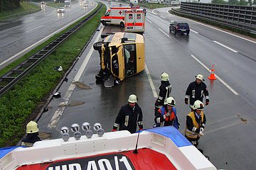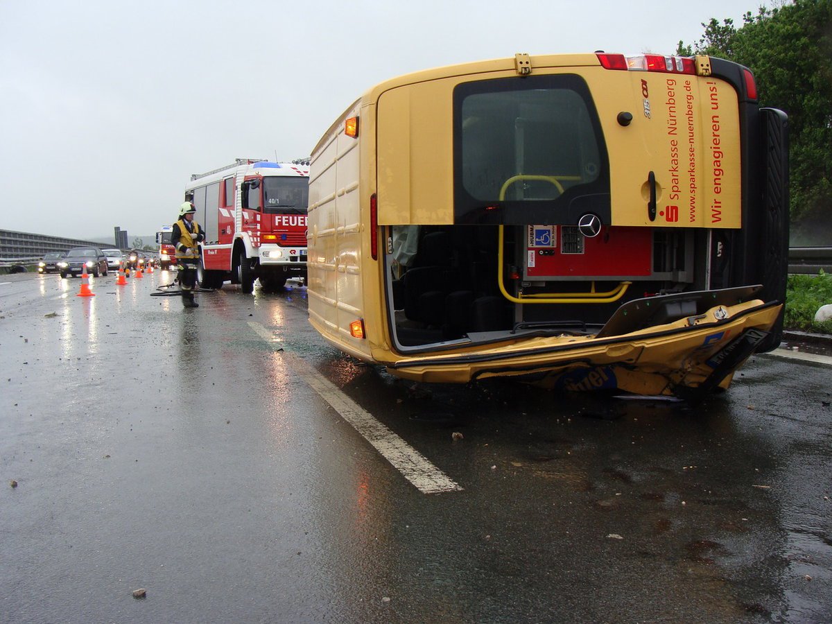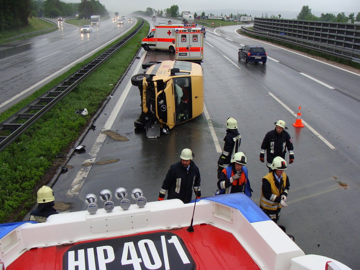 Am Donnerstagmorgen wurde die Feuerwehr Hilpoltstein zu einem Verkehrsunfall auf die A9 Richtung München, mit einer eingeklemmten Person, alarmiert. Ein Sprinter, der mit sieben Personen besetzt war, prallte gegen die rechte Schutzplanke, überschlug sich und kam auf der linken Fahrbahn seitlich zum Liegen. Bereits während der Anfahrt wurde durch die Polizei mitgeteilt, dass keine Person mehr eingeklemmt sei. Die Unfallstelle wurde abgesichert, auslaufendes Öl gebunden und die Fahrbahn gereinigt. Die Autobahn musste kurzzeitig komplett gesperrt werden, da Trümmerteile und Schotter auf allen drei Fahrbahnen verteilt waren.