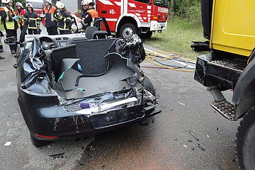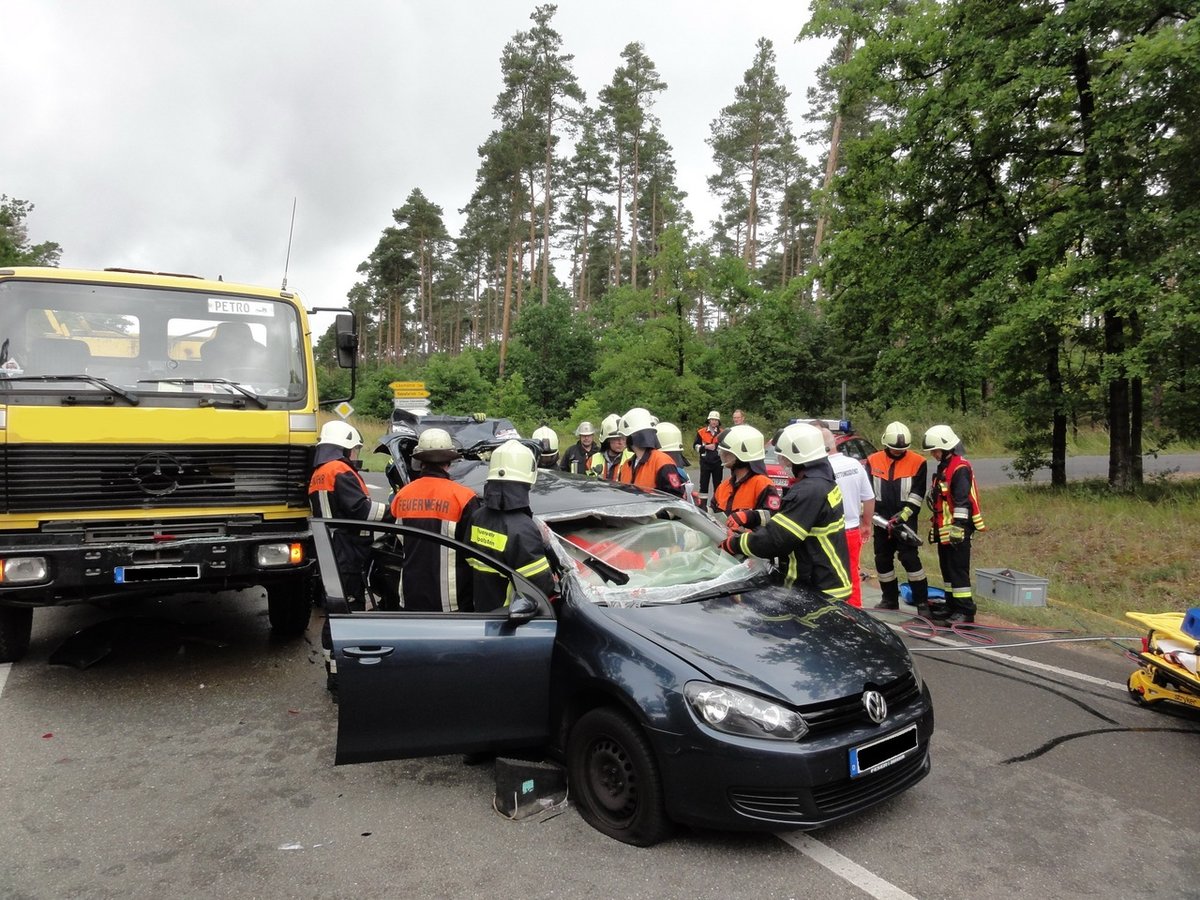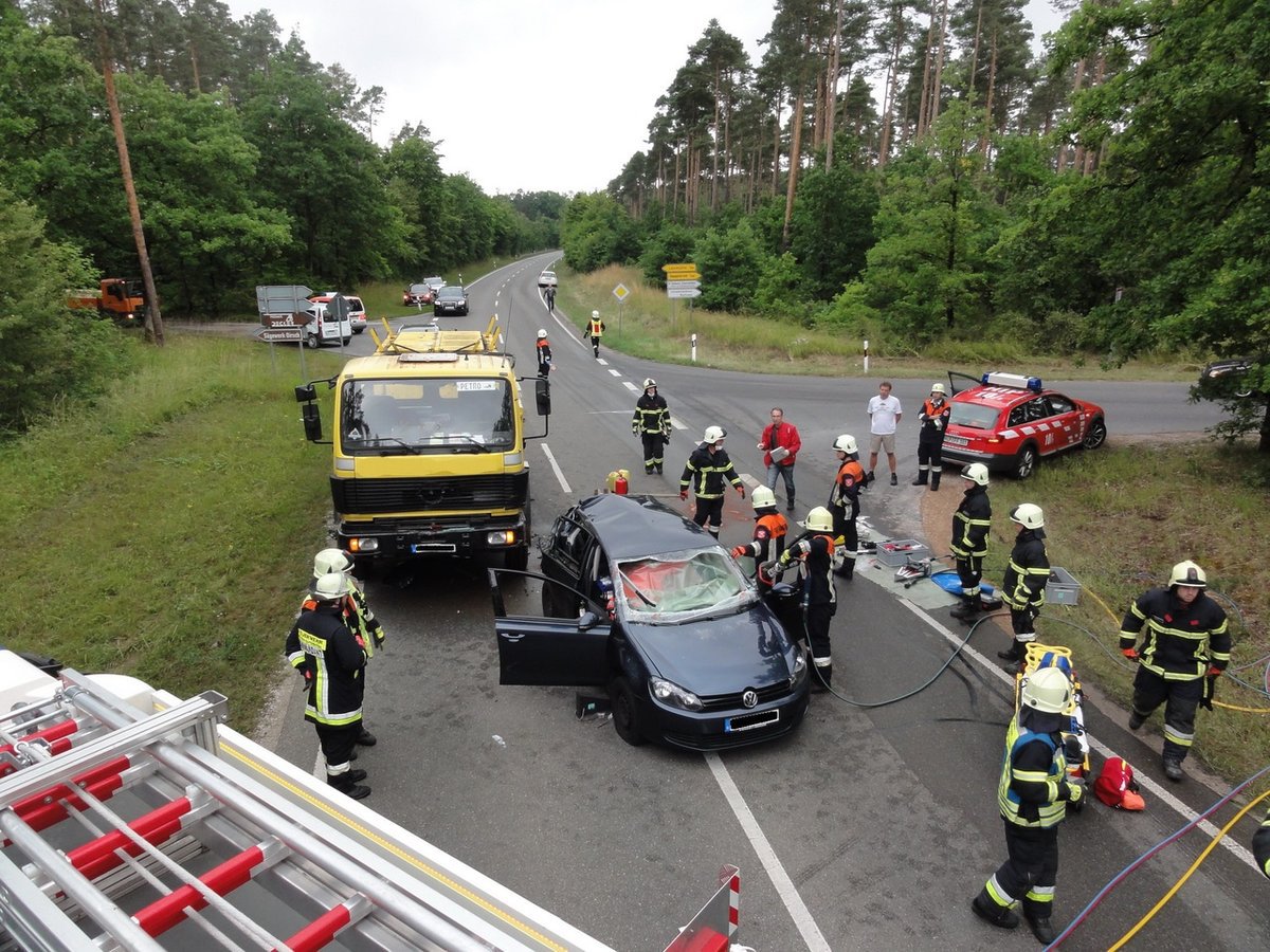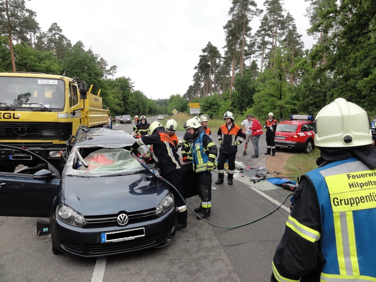 Auf der Staatsstraße St2220, Hilpoltstein - Eckersmühlen, kam es auf Höhe der Kreuzung Haimpfarrich zu einem Verkehrsunfall zwischen einem PKW und einem LKW. Dabei fuhr der LKW nahezu ungebremst in das Heck des stehenden PKW. Nach Absprache mit dem beteiligten Rettungsdienst und dem Notarzt wurde eine schonende Rettung mit Spreizer und Schere vorgenommen. Hierbei wurde zuerst das Dach des PKW´s entfernt um anschließend die Person ohne größere Bewegungen der Wirbelsäule, mittels eines sogenannten "Spineboard", nach oben aus dem Fahrzeug zu befreien. Während des gesamten Einsatzes wurde der Verkehr gemeinsam mit der Feuerwehr Eckersmühlen umgeleitet.